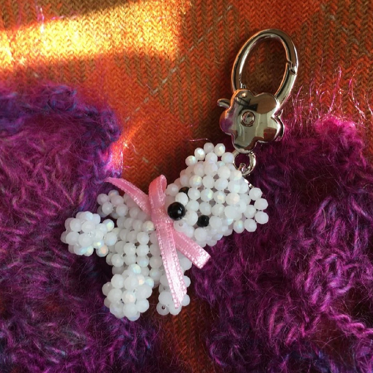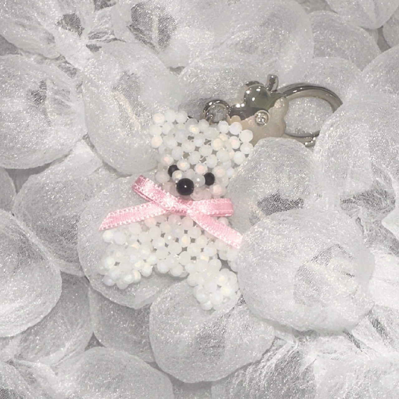 ホワイトで統一されたテディベアと花の形をしたキーリングが素敵なデザインのキーリングです。