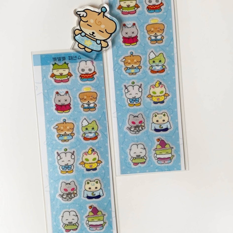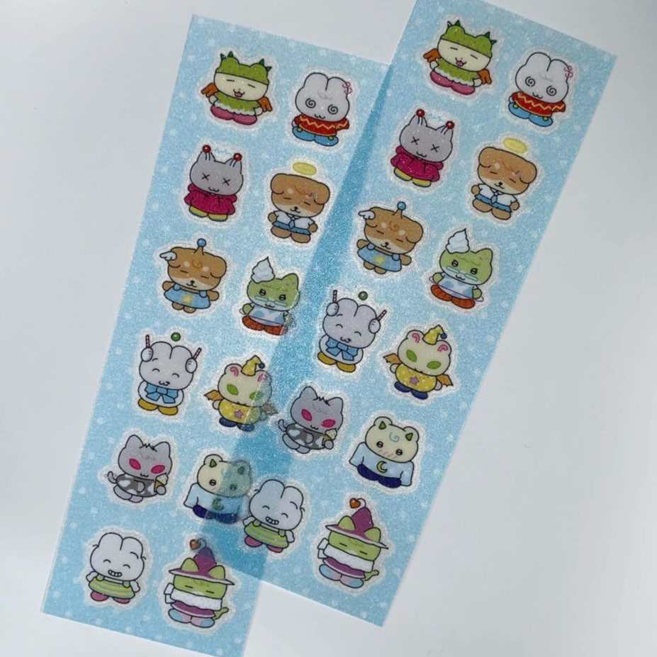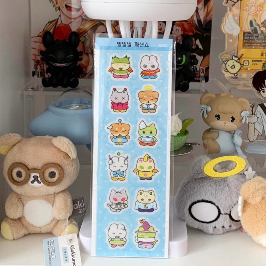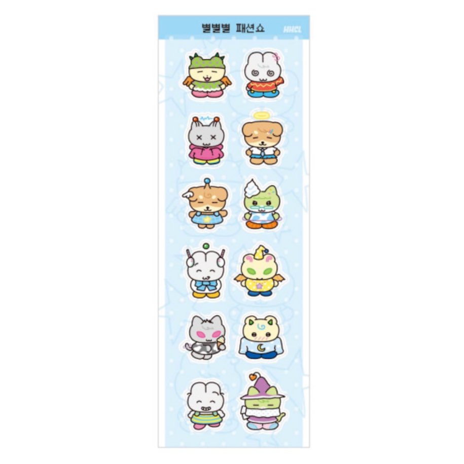 heeheeclubのキャラクターが宇宙人の姿でファッションショーをしているクリアステッカーです。